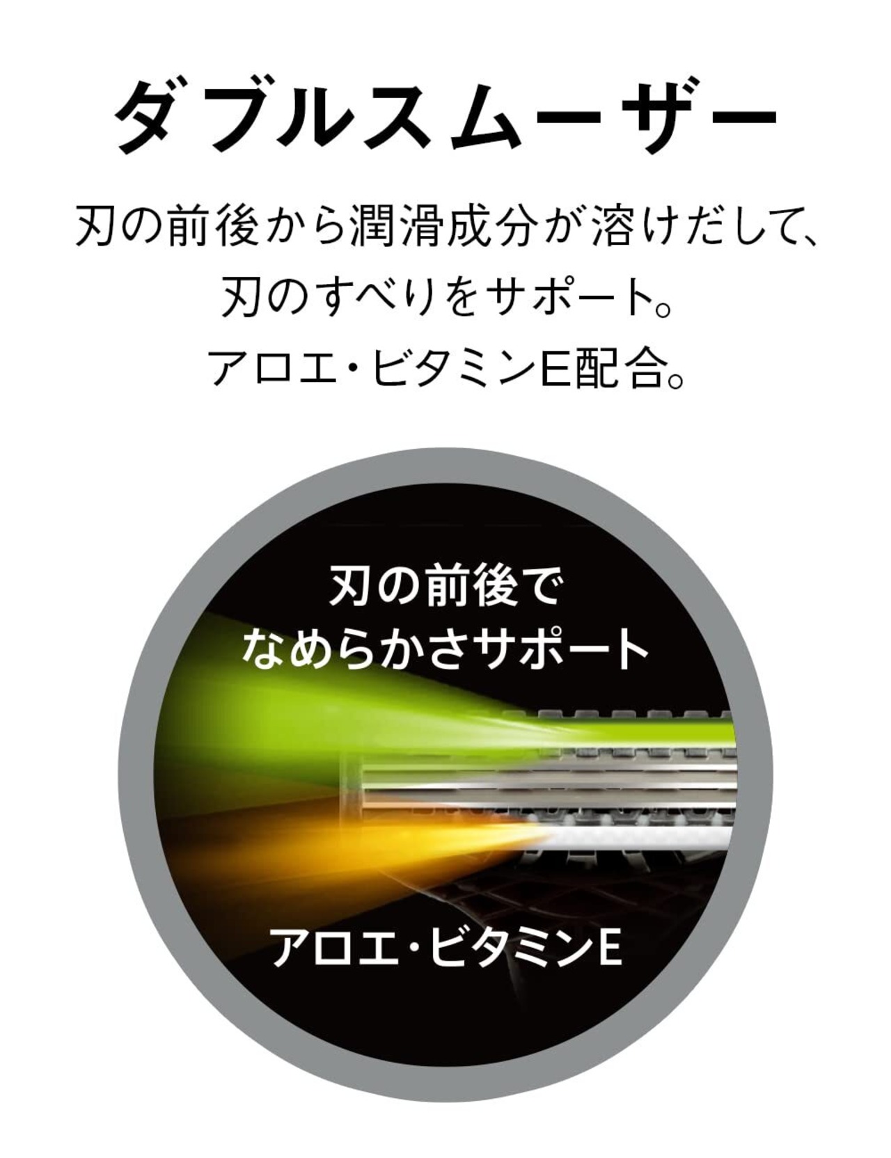 ビタミンE&アロエ配合スムーザー付ラバーグリップハンドルですべらずしっかり剃りやすい